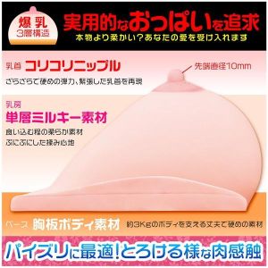 そして、この商品の一番の特徴は爆乳3層構造です。まずは、コリコリニップル。ざらざらした表面と硬めの弾力が緊張した乳首を再現しています。次に、単層ミルキー素材。ぷにぷにとした揉み心地と、食い込むほどの柔らかさが魅力です。さらに胸板ボディ素材は、約3kgのボディを支える丈夫で硬めの素材です。この3層の組み合わせによって、よりリアリティを追求しているんです。