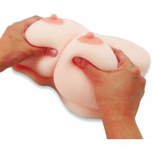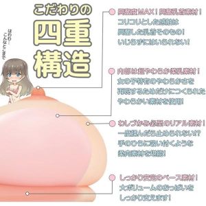 そして、この商品の最大の魅力は、その触感だ。四重素材を使用することで、本物のおっぱいの感触をやわらかくても張りのある感触で再現しているんだ。外側は柔肉素材で肌触りがとてもよく、手のひらに吸い付くような感触が楽しめるんだ。内部はやわらか素材を使い、女の子特有の弾力を持たせているから、揉んだりギュッと抱きしめたりすると、まるで本物のおっぱいを触っているかのような感覚が味わえるぜ。